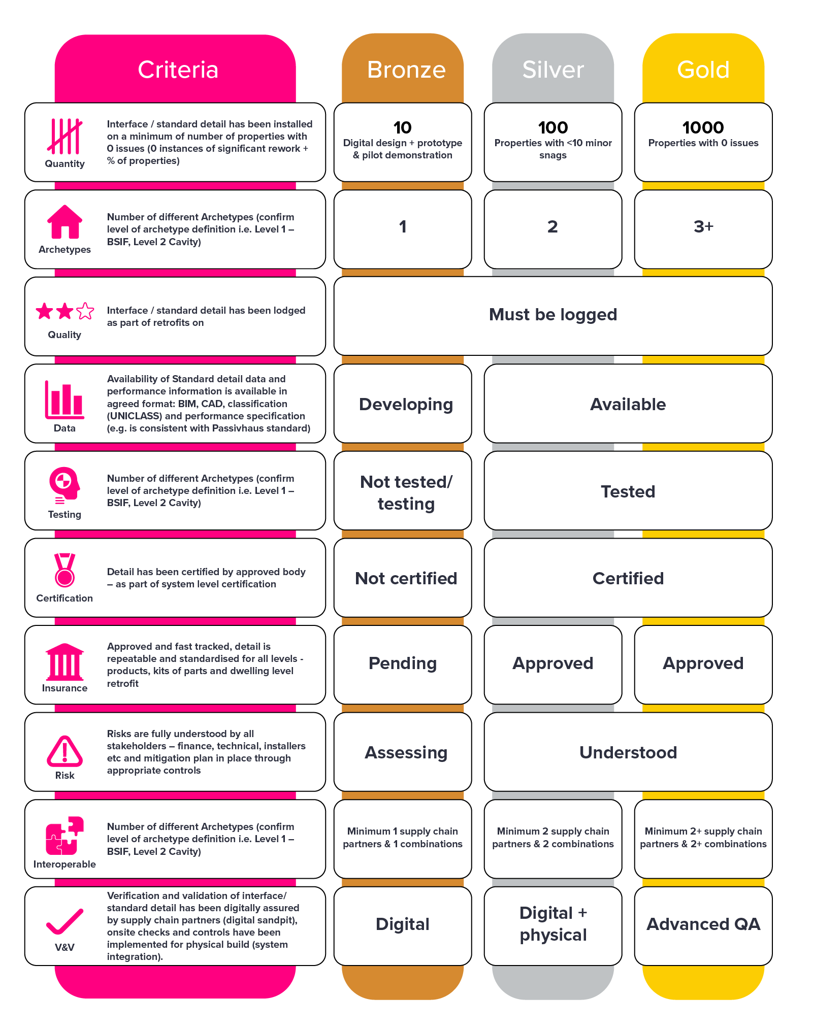 | Gold | Repeatable and standardised for retrofit at scale. Fully certified, insured and financed. |