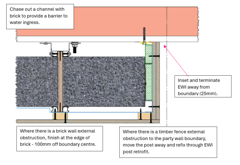 - External wall to party wall: where EWI stops at or wraps onto a party wall return.