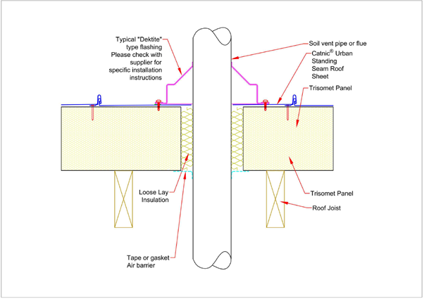 Below is an example of how TATA STEEL’s system tackles a roof penetration interface and the steps/procedure put in place to ensure weather tightness, insulative properties and fire resistance are maintained: