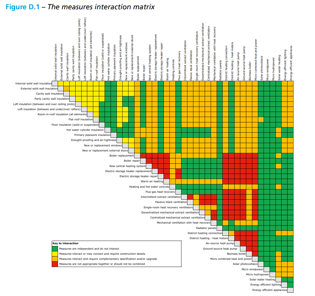 - Once the EEMs have been selected, a more in-depth assessment of the measures Interaction Matrix should be developed using PAS 2035