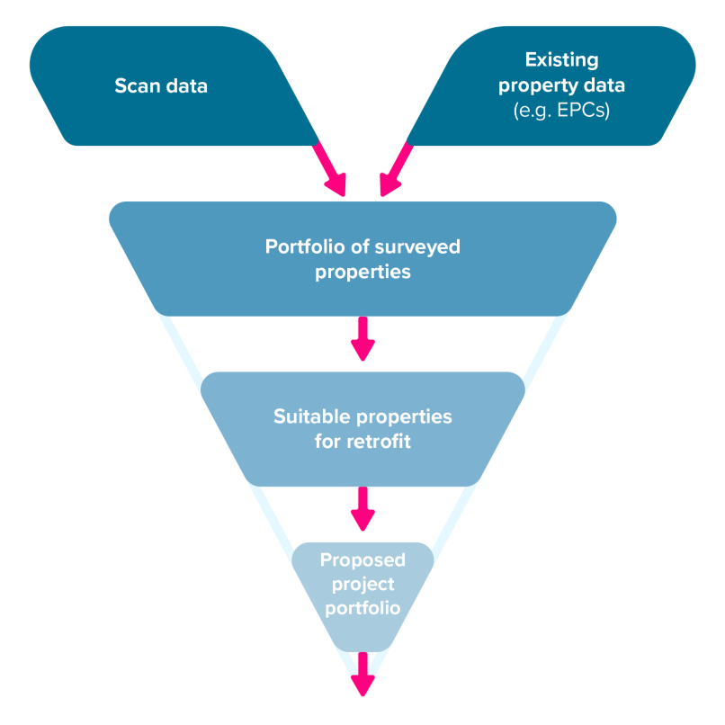 Technology led portfolio surveying methods such as drone scanning are employed, expediating the surveying process, and enabling greater volumes of retrofits to be fed into the pipeline.